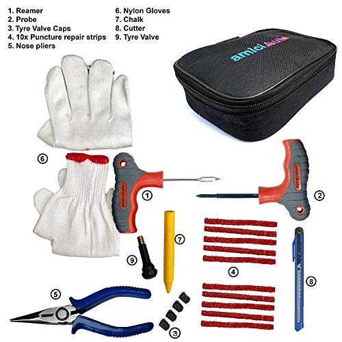 amiciAuto Tubeless Tyre Puncture Repair Complete Kit for Car and Bike (Complete Kit with Easy Storage Nylon Bag)