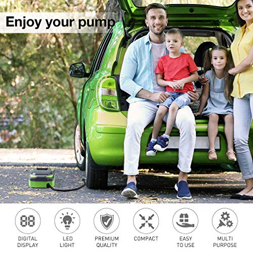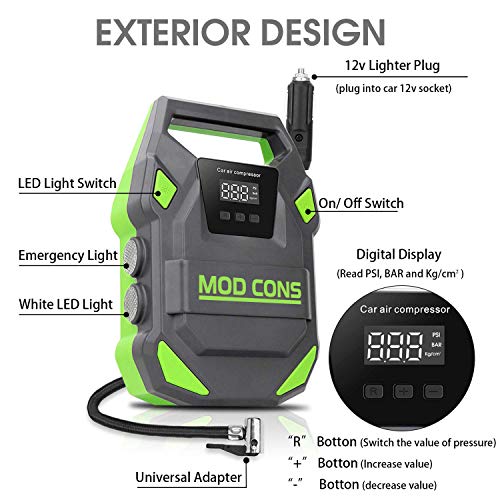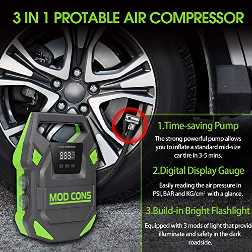 Features & Benefits: ▪️ Get 100% BEST SERVICE AND 18 MONTHS EXTENDED WARRANTY your purchase MOD CONS is totally risk-free! ▪️ AUTO SHUT OFF – The digital air pump will automatically shut off when the pre-set tire pressure is reached, this prevents over inflation. ▪️ DIGITAL LCD DISPLAY – You can easily read the pressure you program, even at night. ▪️ EMERGENCY LED LIGHT – Air compressor tire will illuminate your car even in the darkest place. ▪️ LONG STRONG CABLE – Car air inflator with a cable 3 meter easily connects to a 12V cigarette lighter. ▪️ FAST INFLATING SPEED – Airflow 35L/min will allow you to pump a standard wheel in 3-5min, the max pressure of the tire inflator is 150 PSI. ▪️ 3 ADDITIONAL NOZZLES – It’s easy for you to inflate tire of cars, bicycles, motorcycles, suv, basketballs and also sport equipments and other inflatables.. ▪️ PORTABLE AND EASY STORAGE – Mini air compressor is very compact and lightweight, it is easy to carry and store in any trunk. ▪️If you want to you use the air compressor at home you should buy a AC to DC power adapter 110V-12V (120W) Our high-quality, durable, heavy duty and portable tire inflator is suitable for people who value quality and excellent functionality in use. Specification: ▪️ Power Source: 12 Volt ▪️ Power: 120W ▪️ Material: ABS Plastic & Heavy Duty Metal ▪️ Display Unit: PSI, KPA, BAR, KG / CM² ▪️ Pressure: 150 PSI ▪️ Flow rate: 35L / min ▪️ Cable length: 3 meter ▪️ Noise level: <50db ▪️ Continuous work time: 10 min Package includes: ▪️ 1 x Digital Air Compressor ▪️ 1 x Storage Bag ▪️ 1 x Piece Fuse ▪️ 3 x Additional Nozzles ▪️ 1 x User Manual